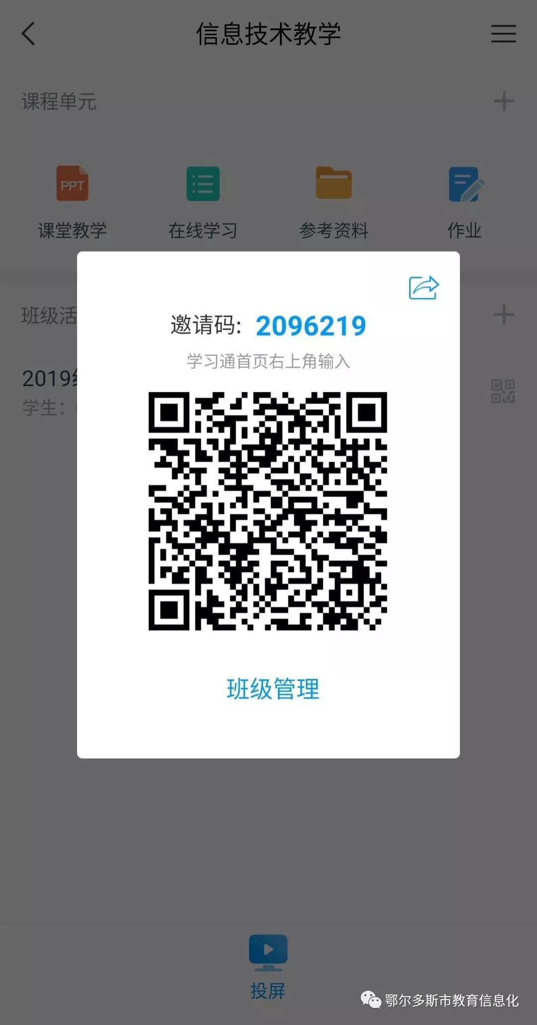 点击班级名称后面的二维码图标,可以打开班级邀请码和二维码,分享给学生(学生在手机学习通APP上填写邀请码或者扫描二维码加入班级)。如果后期不需要给学生在平台上分享资源、布置任务和作业,可以跳过此步操作。