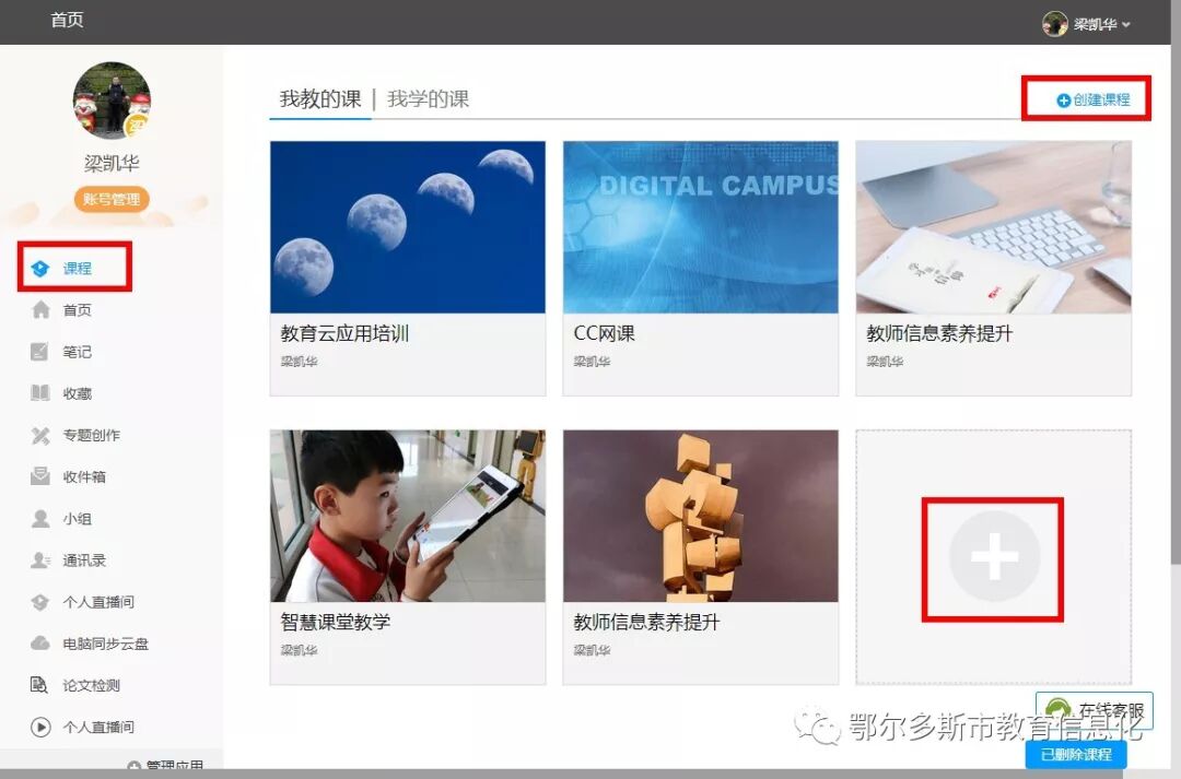 登录后在左侧选择“课程”,然后在右侧选择“我教的课”,点击加号创建课程。