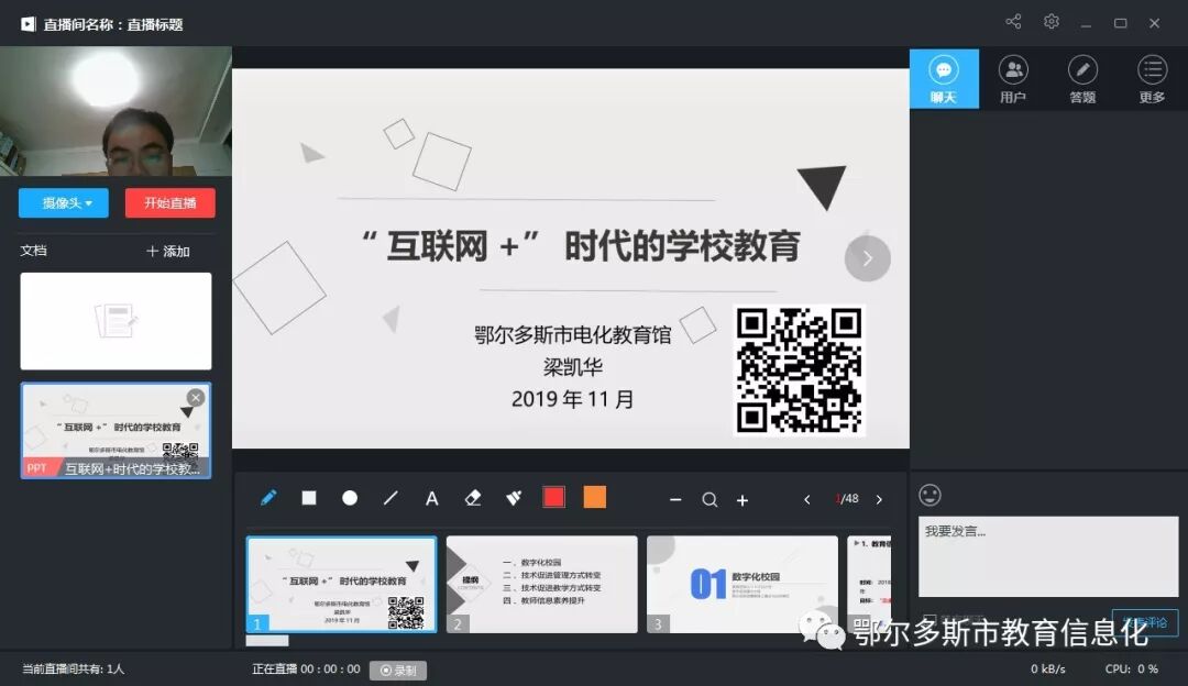 点击左侧的“摄像头”按钮,可以选择直播画面,默认是摄像头选项,学生看到的画面是“当前文档页面+教师摄像头”画面;选择“屏幕共享”,可以将整个屏幕共享给学生,在屏幕共享的情况下,可以利用电脑上的各种软件直播。