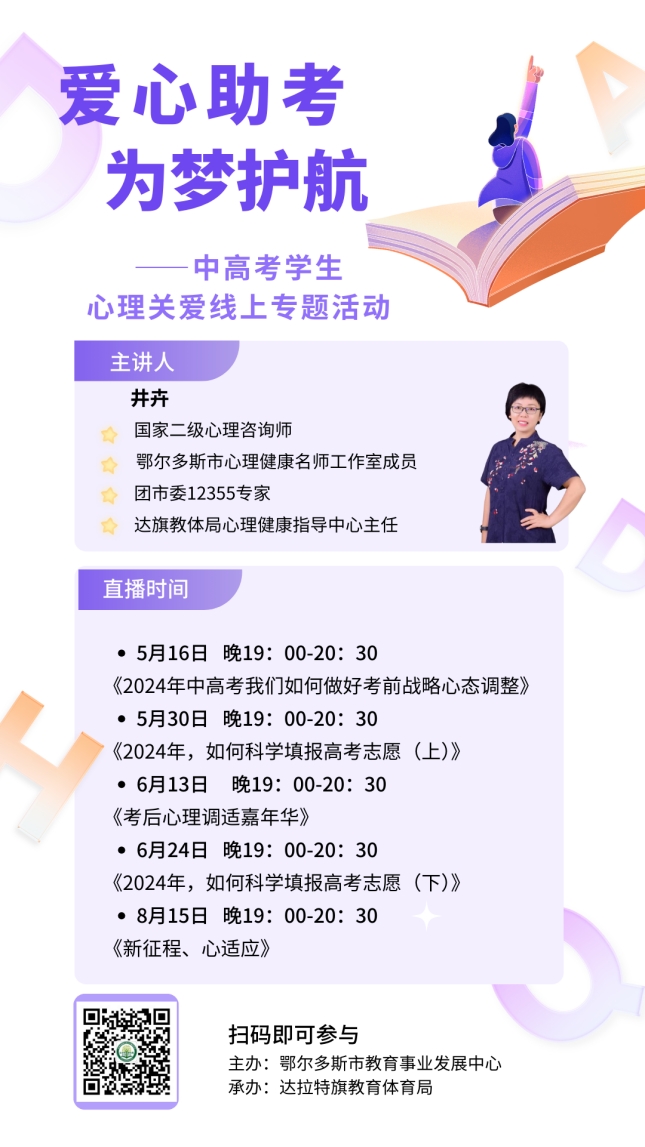 线上活动将由市教育事业发展中心联合达拉特旗教体局在5月16日、5月30日、6月13日、6月24日、8月15日晚19:00-20:30进行,空中家长心理课堂的主题分别为《2024年中高考我们如何做好考前战略心态调整》《2024,如何科学填报高考志愿(上)》《考后心理调适嘉年华》《2024,如何科学填报高考志愿(下)》《新征程、心适应》。心理健康指导教师将为广大中高考家长讲授考生考前考后心态调整的家庭陪护辅导方法、科学填报志愿的基本知识技巧,并线上接待有心理辅导需求的家长,为大家答疑解惑。欢迎有需要的家长扫码关注观看。