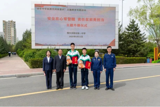 2025年5月12日是第17个全国防灾减灾日,康巴什区消防救援大队鲁丹琦、孙智两位同志专程来到学校,为689班孟梓锐、691班杜绍景两位同学颁发“优秀消防志愿者”荣誉证书。