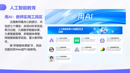 用AI栏目作为教师教学的“智能工具箱”,成为本次培训的核心内容。杜新跃老师逐一讲解了星火教师助手、希沃白板、九章数学智能诊断、九章智能答疑、央馆AI科学实验、网络画板数学实验、多智能体课堂七大工具的功能与使用要点。七大工具精准对接备课、授课、辅导等教学场景,如希沃白板可快速生成教学设计、学生评语等内容,九章数学智能诊断能精准定位学生知识薄弱点,央馆AI科学实验可一键生成实验设计方案并提供配套课程资源,多智能体课堂能实现学生与AI教师实时互动,助力大规模因材施教。同时明确,除多智能体课堂外,其余工具暂仅支持Web或PC端操作,星火教师助手目前仅限基地校使用。