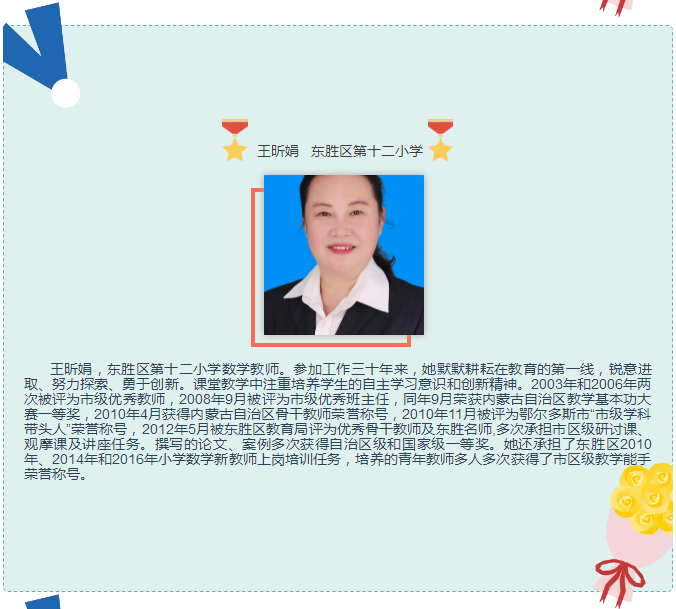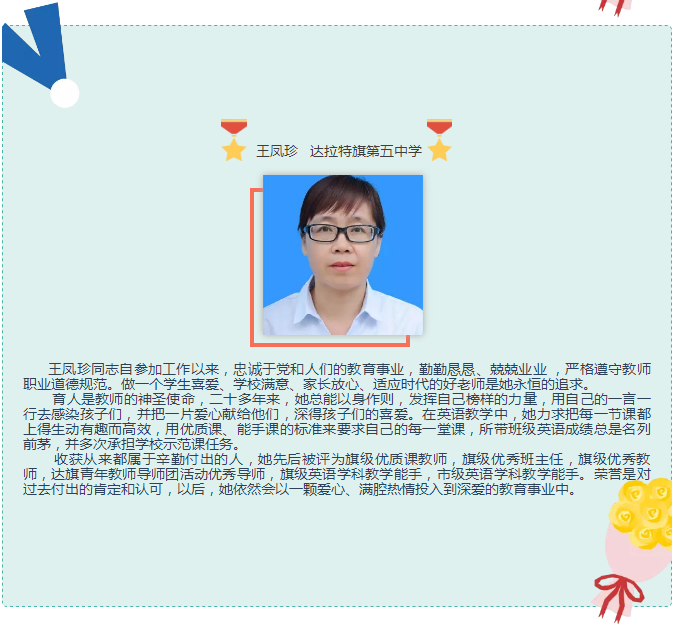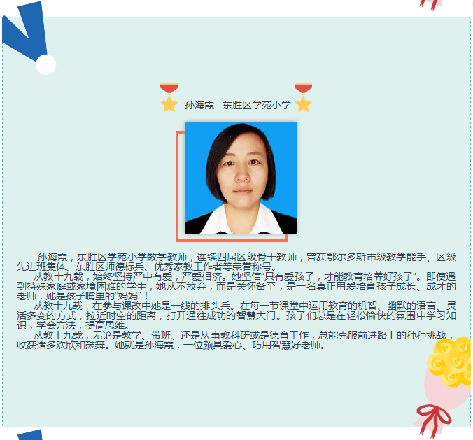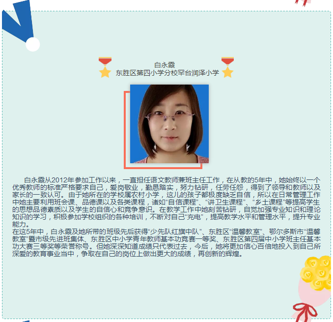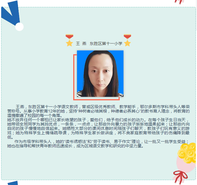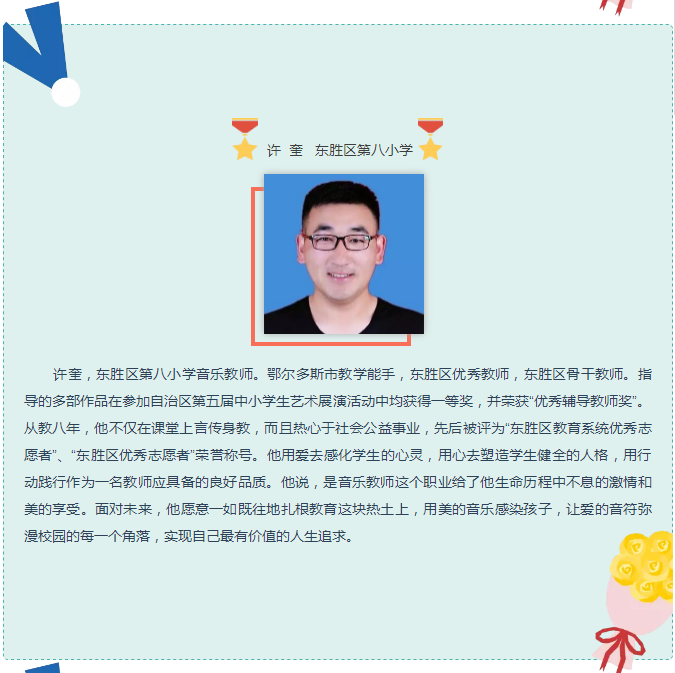 他在教育的长河里摆渡,在知识的海洋里导航,把每一个40分钟用汗水和智慧编织成无数个耀眼的光环,用信任和鼓励引导每一位学生进步,用真诚和辛勤铸造班级的整理实力,展现了一位辛勤园丁的风范。