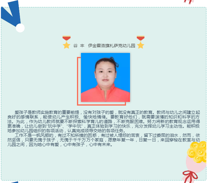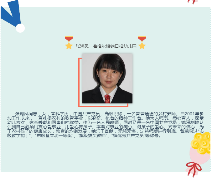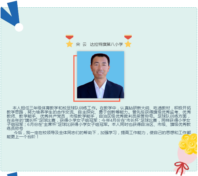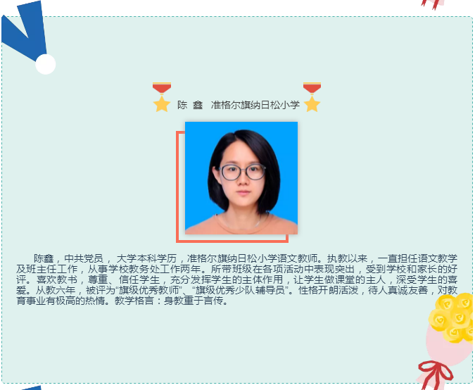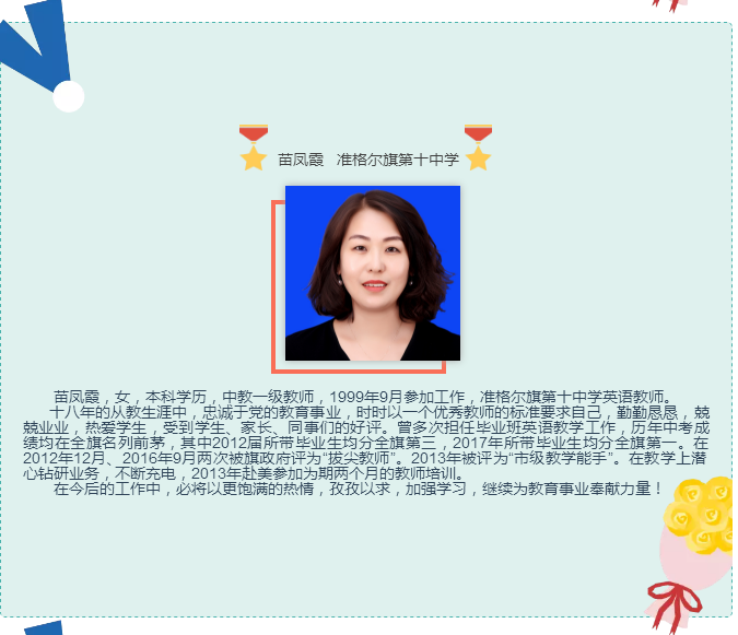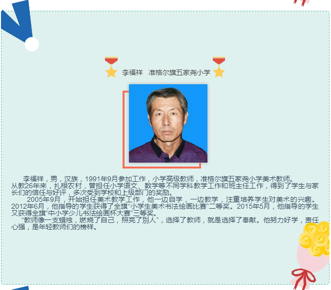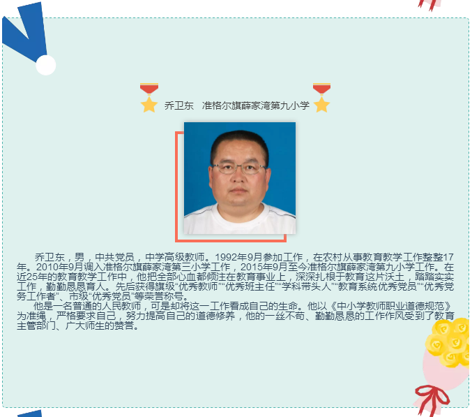 他在教育的长河里摆渡,在知识的海洋里导航,把每一个40分钟用汗水和智慧编织成无数个耀眼的光环,用信任和鼓励引导每一位学生进步,用真诚和辛勤铸造班级的整理实力,展现了一位辛勤园丁的风范。