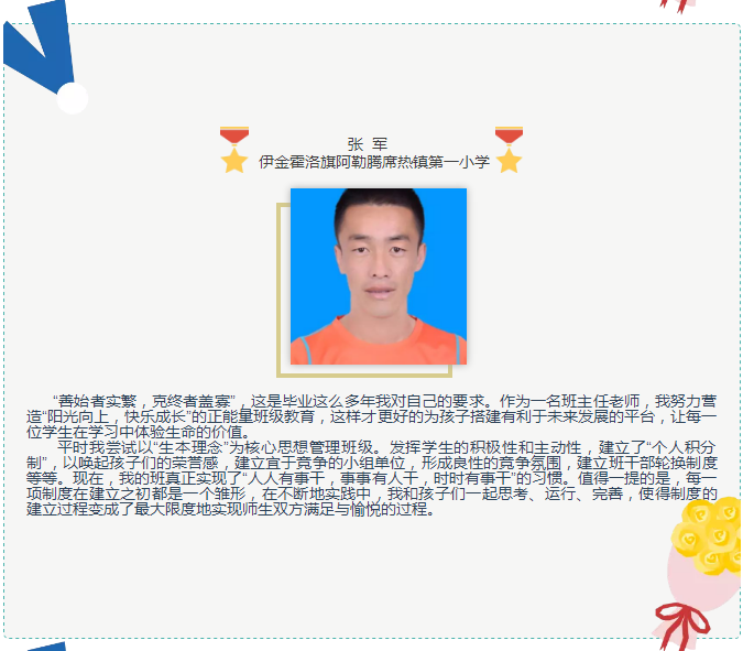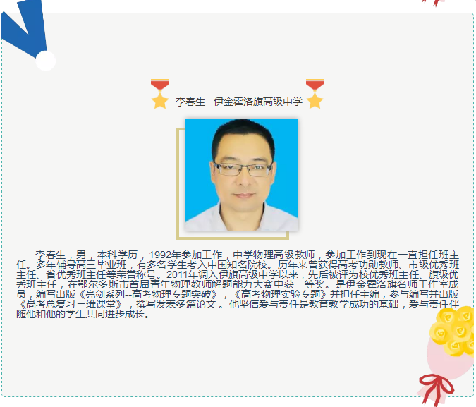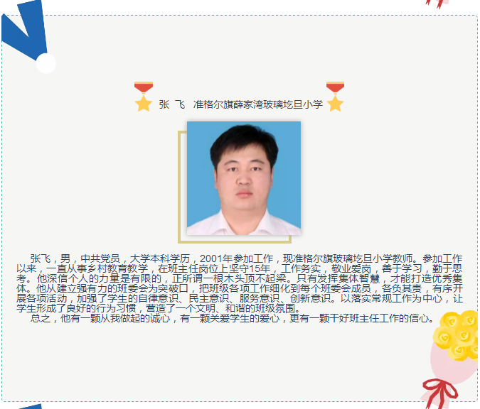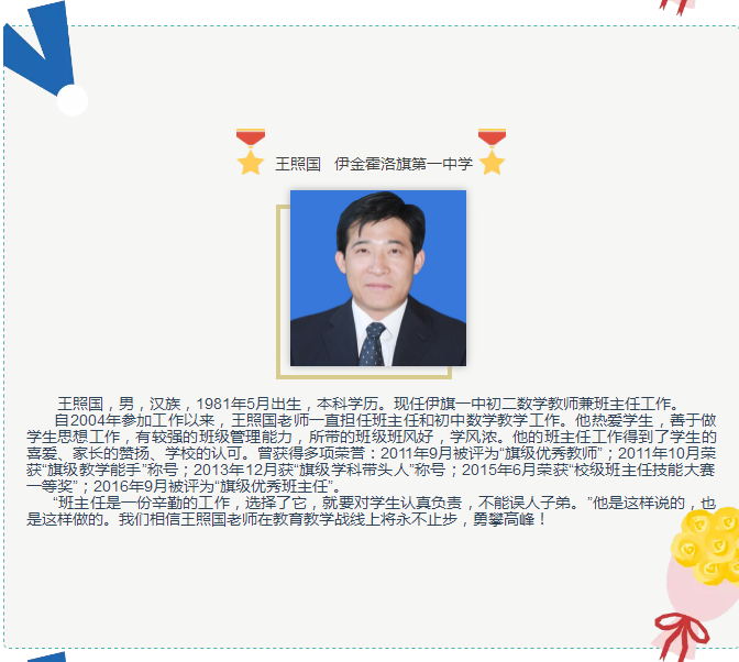 静能春风化雨,润物无声;动能点石成金,琢璞成器。班主任,没有级别的主任,却担当着最大的人生责任。校园里,总能见到你们步履匆匆的身影;教室内,总能听到你们谆谆善诱的话语。可敬可赞,教学之路上挥洒着你们的青春和才华;亦师亦友,育人之途中流淌着你们的辛勤和奉献。