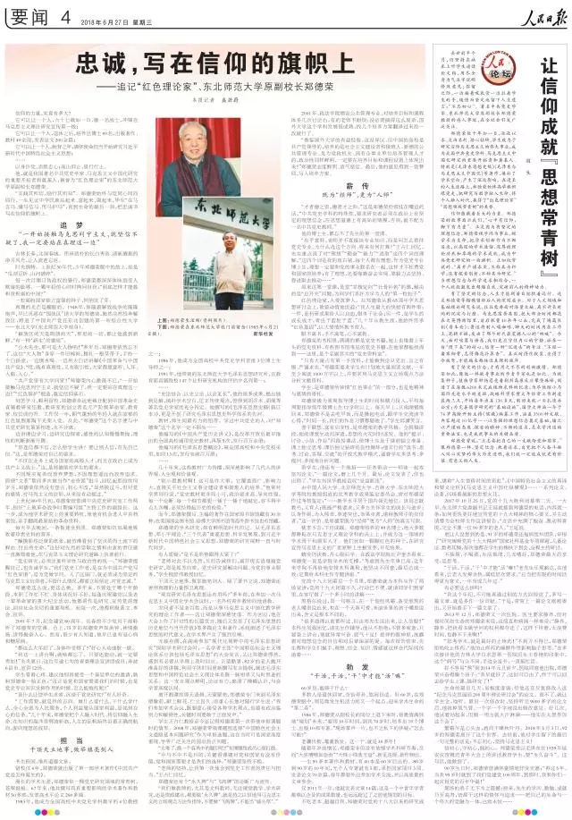 2018年5月3日,中共党史学家、马克思主义中国化研究的重要开拓者和奠基人,被誉为“红色理论家”的东北师范大学原副校长郑德荣同志因病去世,享年93岁。教育部追授郑德荣“全国优秀教师”荣誉称号。6月27日,《人民日报》整版报道:刊发长篇通讯,以“忠诚,写在信仰的旗帜上”为题,报道了郑德荣教授的感人故事,并配发评论员文章“让信仰成就‘思想常青树’”。随小编一起看全文↓↓↓