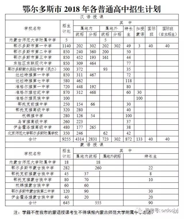 根据教育部、自治区教育厅统筹普通高中与中等职业教育协调发展的相关要求,结合我市高中阶段教育发展情况及应届初中毕业生情况,确定我市2018年高中阶段学校招生计划。2018年,我市普通高中计划招生9900人,其中汉授9255人(根据《内蒙古自治区教育厅关于内蒙古师范大学附属中学面向全区招生的批复》要求,向我市非盟市政府所在地招收汉语授课学生5人),蒙授645人(根据《内蒙古自治区教育厅关于做好2018年内蒙古师范大学附属中学蒙古语授课高中班招生工作的通知》要求,内蒙古师范大学附属中学向我市招收蒙古语授课学生18人);中等职业学校计划招生7650人。