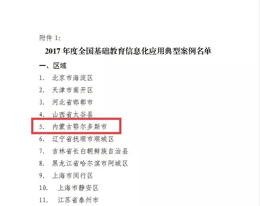近日,教育部基础教育司下发《关于公布2017年度基础教育信息化应用典型案例名单并做好2018年度案例推荐工作的通知》,鄂尔多斯市作为内蒙古自治区唯一区域案例成功入选。据了解,这也是鄂尔多斯市连续两年被教育部评为全国基础教育信息化应用典型案例区域,全国仅有上海闵行区、重庆大足区、内蒙古鄂尔多斯市三个区域连续两年获此殊荣。此次鄂尔多斯市入选案例为《借力信息化创新发展动漫教育推动多学科深度融合、提升学生核心素养》。